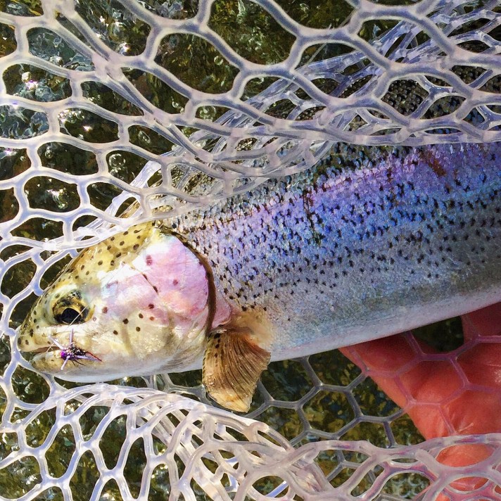 I am reveling in the moment unfolding and cannot wait to see if we can meet this trout.  It sees the net and runs, pulling line out.  I yell, “Let it go!” “Rod Tip Out!” as I motion for The Kid to keep the rod at an angle.  His Uncle is just as excited and coaching him perfectly as I move into position.  The trout comes close, I reach for it and it runs down just out of reach, headed for a pile of junk just below.  “Rod Tip UP!”  “Try and get the head up!”  The fish turns back towards the boat and moves for me.  I get out of the way, I can hear The Kid and all his enthusiasm.  Its wicked cool.  The trout tries to go under the boat.  I duck under the line and scoop the trout into the net just in front of the boat avoiding disaster.  The chaos only builds!  Its a wonderfully bright, post spawn, leapord spotted, rainbow.  Hefty trout, not the longest trout at around 18 inches but fat and full of newly invigorated muscle from chowing down after the spawn.