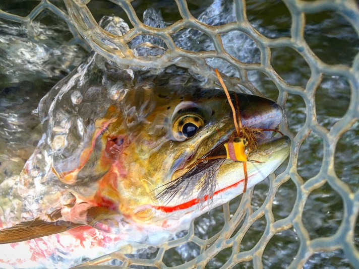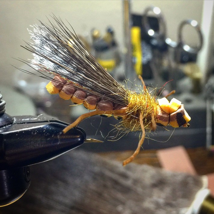 Golden’s though, they dance and jump like a mayfly when they hatch, they float high, and they move a lot. I tie foam for Golden’s, use moose for a dark flat good floating wing, and throw six silly legs on there to give the fly movement. I use yellow gold foam and color it with a sharpie, and I use a larger hook gap because fish like to play with Golden’s so a wider hook gap usually helps with fish that don’t get the large fly in their mouth.