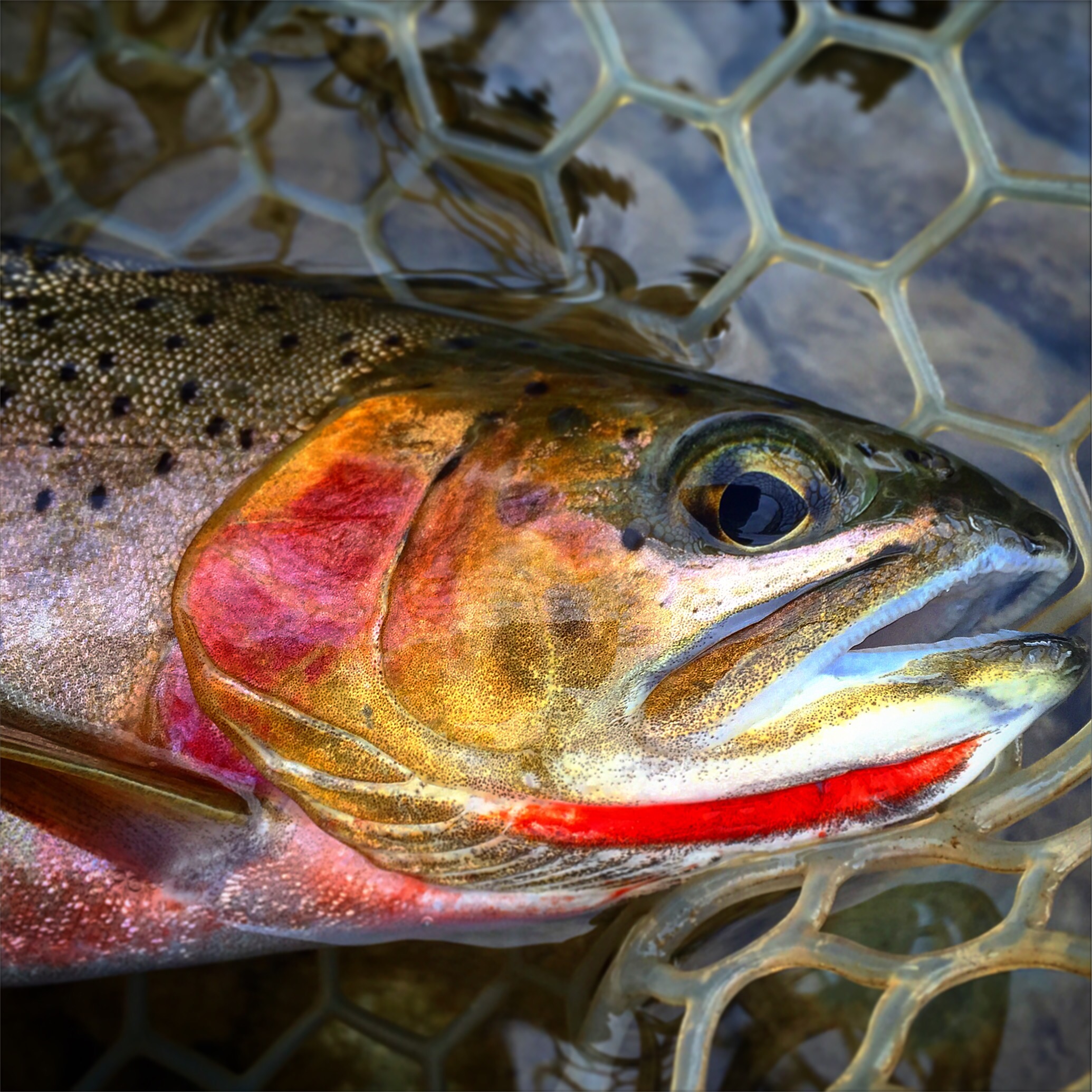 My attention of course focuses on the trout. I watch intently, seeing the small cutthroat rise on occasion for the small BWO Mayflies that are sporadically hatching out of the riffle above the wild animal. My thumb taps the cork of my fly rod rhythmically, as if I have a tick that develops every time I see a trout feed. I want to cast to it, but I have the wrong fly on, the fish is on a slow easy feeding rhythm, and a part of me doesn’t want to bother this particular trout for some reason. Content with just watching this fish, I lay my fly rod and net down along a fallen log covered in damp moss. The clouds above are heavy with moisture, the moment is quiet, save for the riffle and the trout dimpling the surface ever so slightly. I sit along the bank, enjoy a smoke, and it is as if the trout knew I was there and was not a threat. It began to feed more aggressively. With slashes to the surface and showing its small head from time to time. The flash of neon orange from its cutts and the chartreuse shimmer of the tail as the trout moves about the feeding lie with ease. My hand twitches again but I stay it, relaxed and enthralled by this small wild westslope cutthroat no more than 12 inches or so.