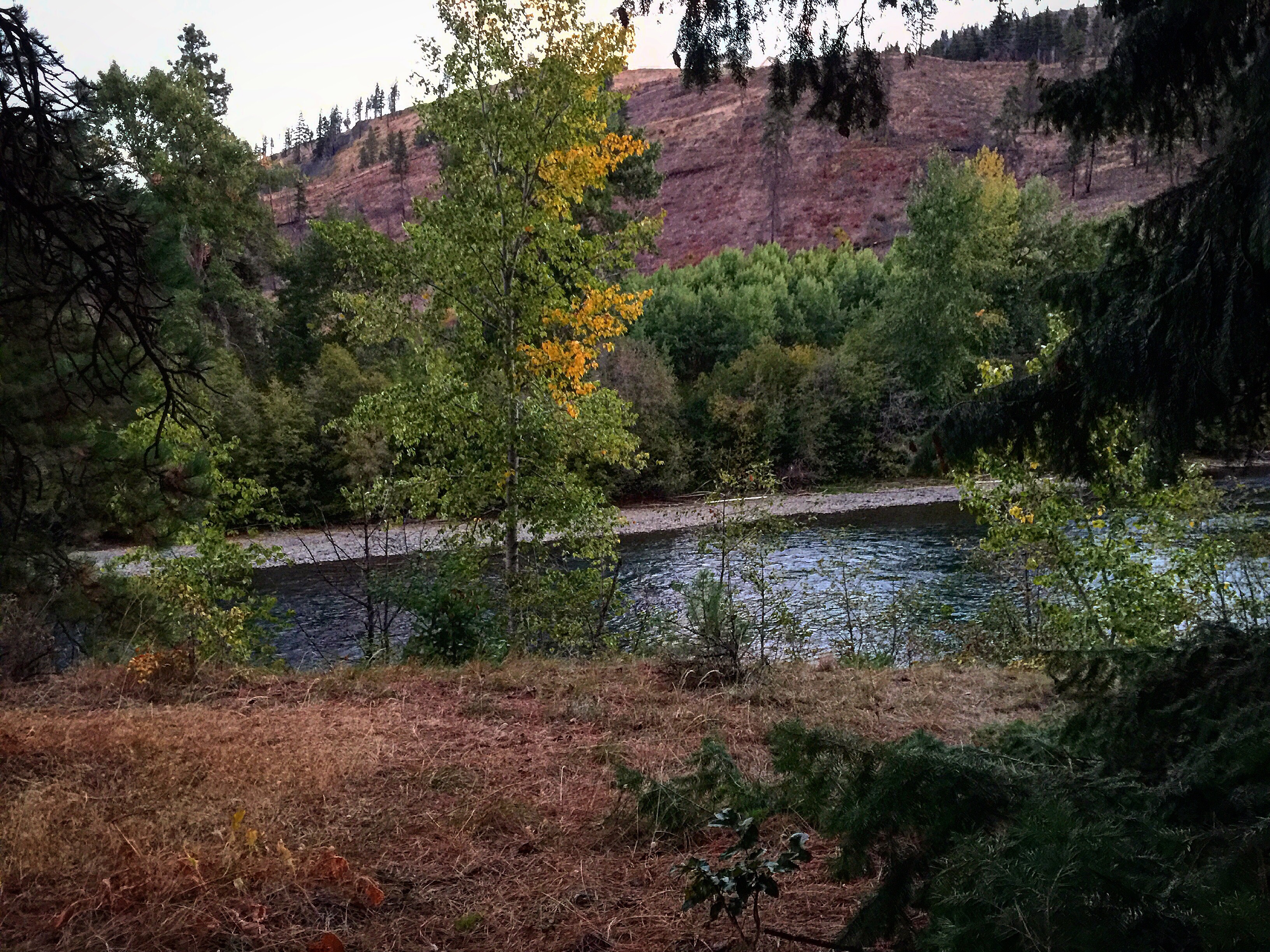 No the day was just a regular day. The sounds and smells of autumn and the river enveloped the senses. The smells of the trees, a slight fishy smell of the decaying salmon, the sound of a quick riffle, the faint singing of frogs, a raven calls, the thicket shifts from a critter within, the distinct sound of a fish rising slowly on the surface.