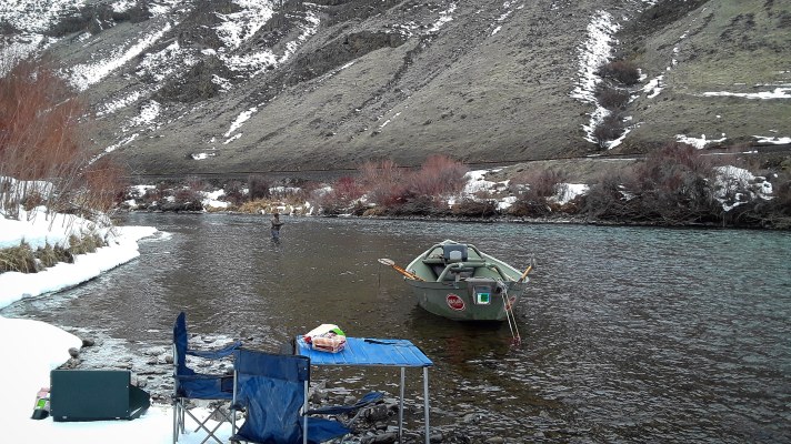 I’ve fished for just over a week on the Yakima every day. Floated a few, guided a day, and have been walk and wading most days. I find walk and wading to be a much faster way of getting the body back into guide form. Rowing is great but at these flows it’s hardly work. But wading, up and down, crossing, standing in freezing water, slinging a six weight, crawling up and down snow banks and logs, post hole-ing and cursing the gods, that shit trims the winter weight right down, kinda loosens up the body and I get to walk the river a few miles a day.