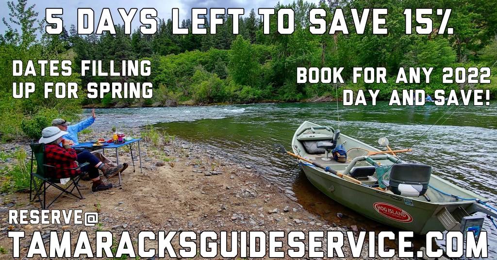 > tamaracksguideservice posted: ” You still have 5 days left to save 15% on > your final trip balance. I’ve got my early booking special running, reserve > any day in the 2022 season, and save 15% on your final balance. The spring > is filling up and I’ve already got dates booking for ” >