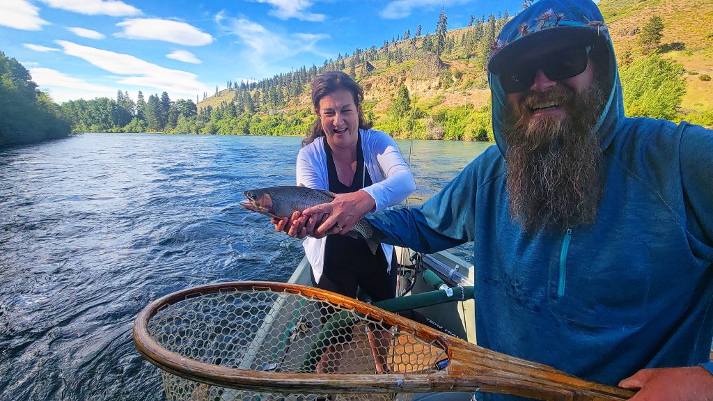 When you take a trip with me it all about fishing and the experiences that happen along the river. I love getting my clients to have great moments with our trout here. Ask me all the questions you can, I want to teach as much as you want to learn. Whether you are an experienced angler or brand new to the sport I love sharing this river with people. I guide the Yakima River and many other secret waters in the area. When you give me a call I will ask you lots of questions as I want to make sure you have the best experience possible while chasing the trout we have here. Whether its a guided river float or a hike and fish, or a walk and wade to the secret places, I can help make your fly fishing experience memorable and fun.