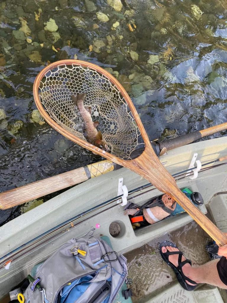There are lots of nets. I wade with my boat net. Yes, my net is a 200-plus dollar net. It’s lasted me over 5 seasons of heavy use. It is over 4ft long, which gives me a huge reach and advantage when netting fish on foot or in the boat. It has a wide custom-made basket to scoop and net fish easier and quicker. And it looks nice because I like nice things for my troots and to show off fish to clients. Nets come in all shapes and sizes. I recommend a longer handled net or one that extends. Doesn’t have to be expensive, rubber net. That’s all.