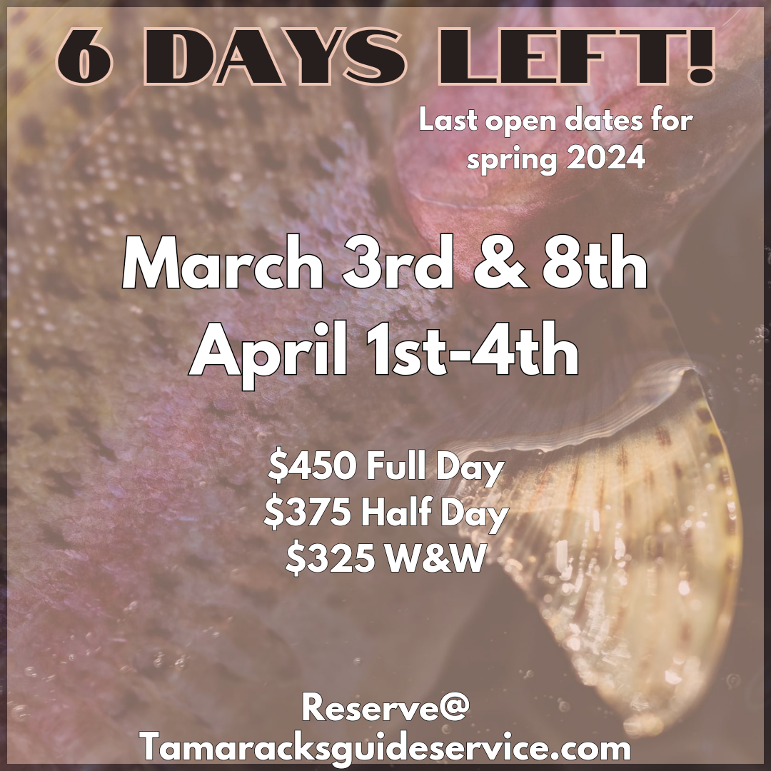 I’ve only got these 6 dates left for spring anglers. Whether they fill or not, my Spring is pretty much full.